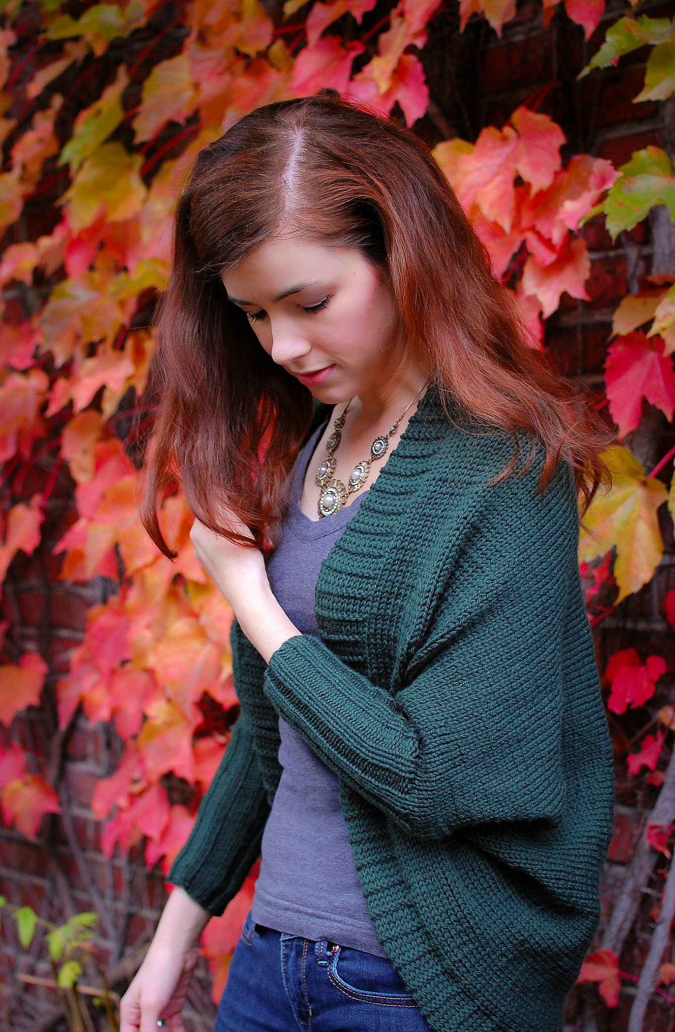 Wow, this turned out so nicely! What a cool shape and gorgeous colour on you. These photos are great with the autumn leaves. And I love your beautiful necklace and hair. Hehe, lots to love in this post 🙂