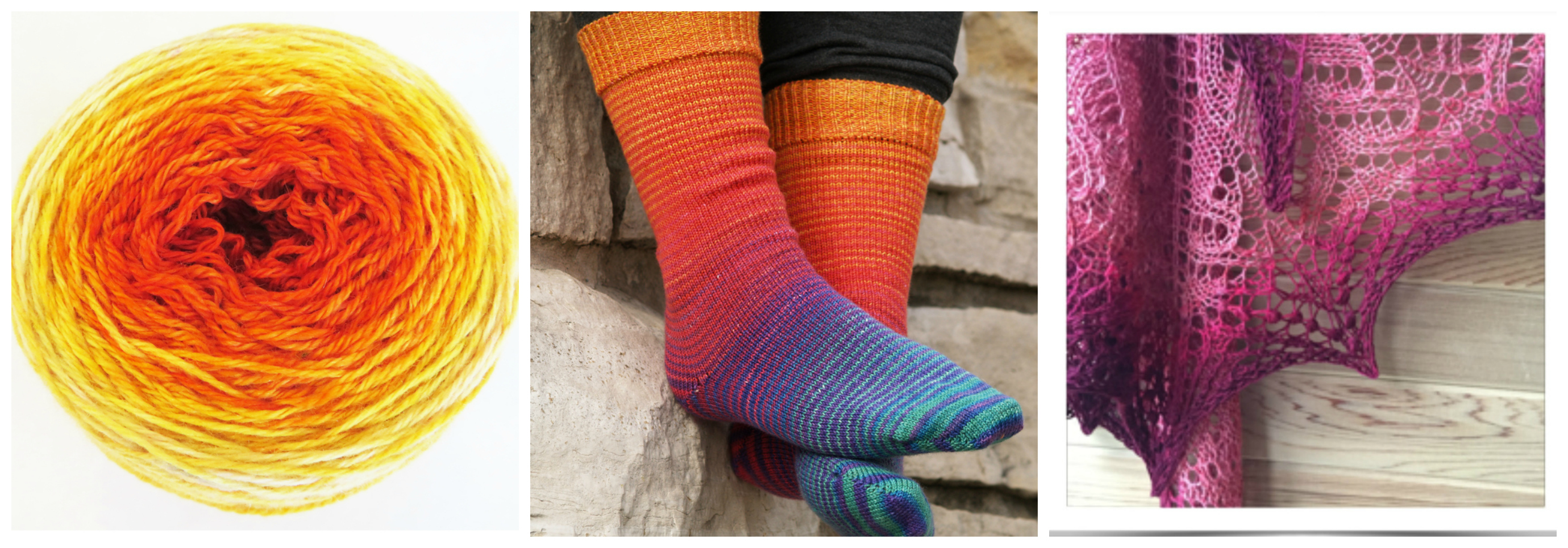 A Few of My Favourite Things, from Left to Right: I think this skein of ‘Summer Afternoon’ looks just like a marigold! This colourway can be dyed in any of Knitcircus’s bases, which means you can have it in a variety of fingering weight, DK, or Worsted. These chromatic stripe socks in ‘Over the Rainbow’ are specially dyed to create two matching socks that both stripe chromatically- how cool is that! As usual, you can choose from three different fingering weight yarn bases. This Lieutenant’s Heart Shawl kit is stunning, and you can choose fro a variety of colourways, but I’m partial to the colourway that the pattern is named for (shown here), ‘Lieutenant’s Heart.