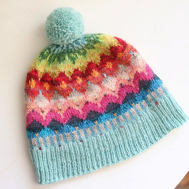 What Makes This Awesome: Ah, the colourful yoke sweater – such a great source of inspiration! Laura loves a colourful yoke, and decided to make a hat for her daughter using a yoke from the Christmas in July sweater pattern, which she’s knit before. Changing a yoke to hat isn’t completely straightforward, it does take a bit of finessing when the decreases at the crown begin, and Laura adjusted the pattern to allow for the decreasing at the crown to be worked in a way that made sense for the both the hat and the pattern. Improvising is a useful skill when knitting with colourwork, but when working with an item like a hat, you can always rip it back a tiny bit if you don’t like the way the improvised bits are working out.