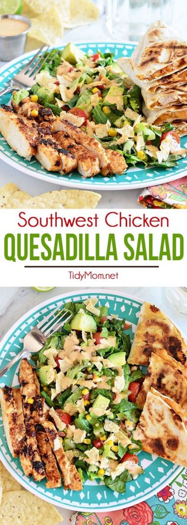 I don’t know about you, but I need to really get more salad into my life. This southwest style chicken quesadilla salad is family friendly and covers all the bases. Pinterest link is here, original recipe post can be found here.