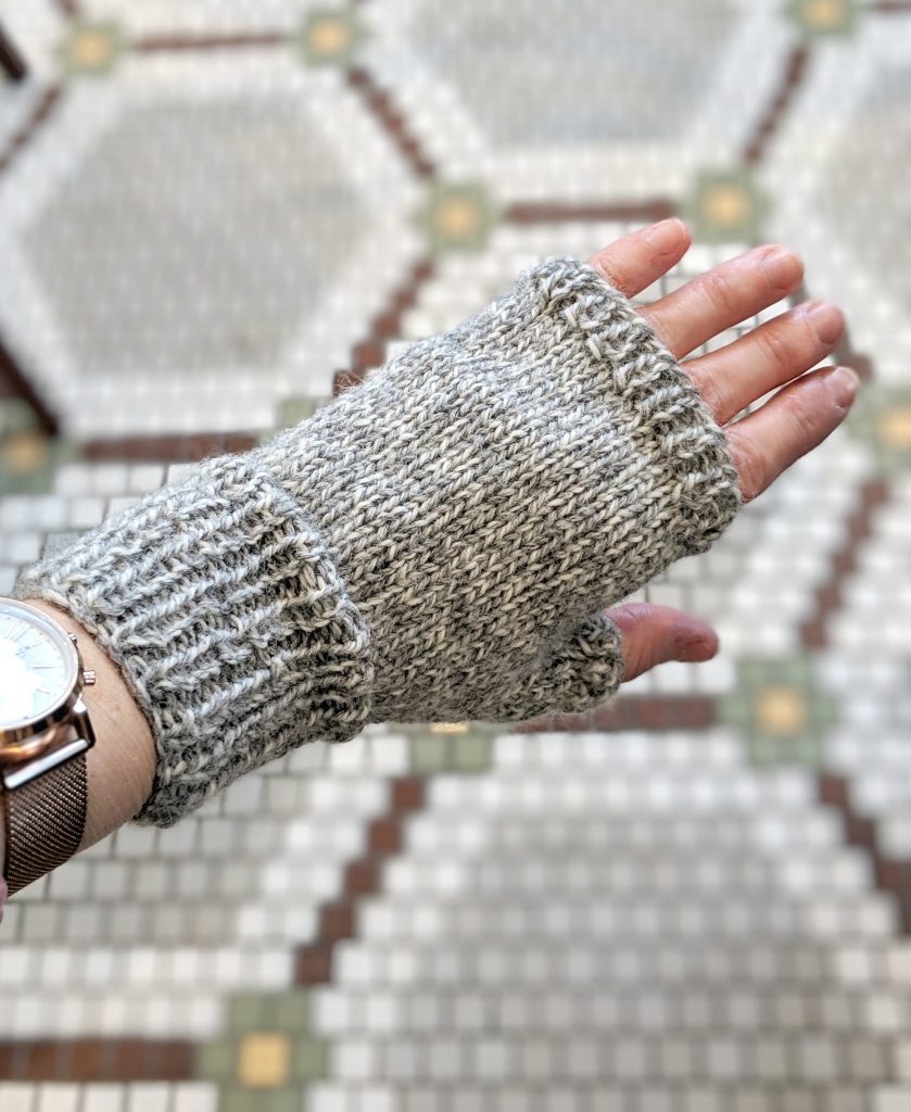 I’ve long been interested in marled yarn, there is something so visually appealing about the stripy swirl of two colours together that adds a bit more dimension and visual interest, especially in simple stitches. Case in point – I wanted to knit a very simple pair of fingerless mitts with this yarn- not that you can’t do textured stitches in marled yarn, but I wanted it to be all about the yarn, and not about the texture. You can see the beginning of these mitts in a previous post here, where I’m talking more about yarn affordability and stashbusting tips & tricks.