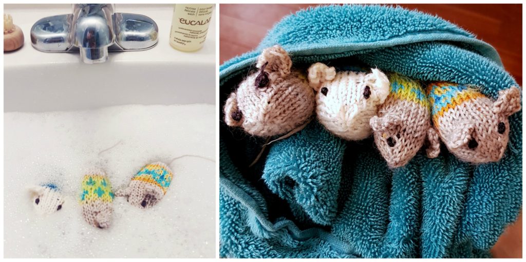 Then they got all gross and chewed on and I knew the kids would inevitably pick up the mice, so I washed them in some unscented Eucalan (because it’s non-toxic, pet-safe, and baby-safe):