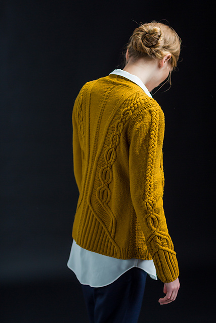A beautiful cabled button up cardigan in a classic shape, full of tailored details and set in sleeves. This DK weight pattern is knit in pieces from the bottom up and seamed together, with thick cables accenting details on the back fronts, and sleeves. The cables are not for the cabling novice: 8 different charts and 20 – yes, TWENTY – different types of cable crosses in the legend. Chart reading skills and total sobriety are a must – if you want to have a glass of wine and put on Netflix then you are living dangerously, my friend.
