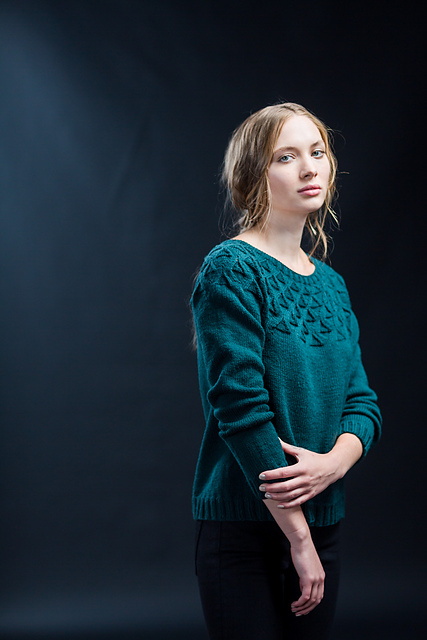 A DK weight pullover knit in the round from the bottom up, Kirigami is a straightforward knit. The yoke is fully charted, and the body has some waist shaping and some short rows at the bust.