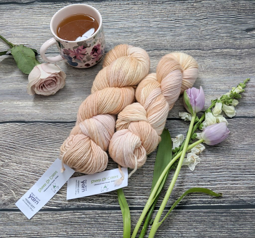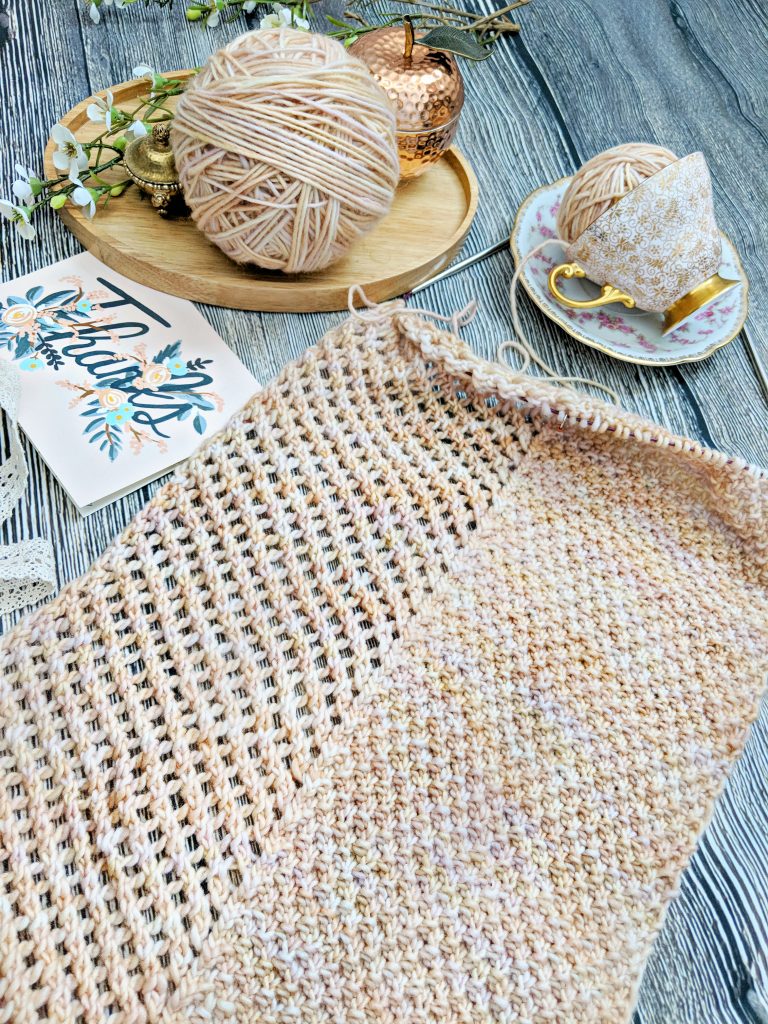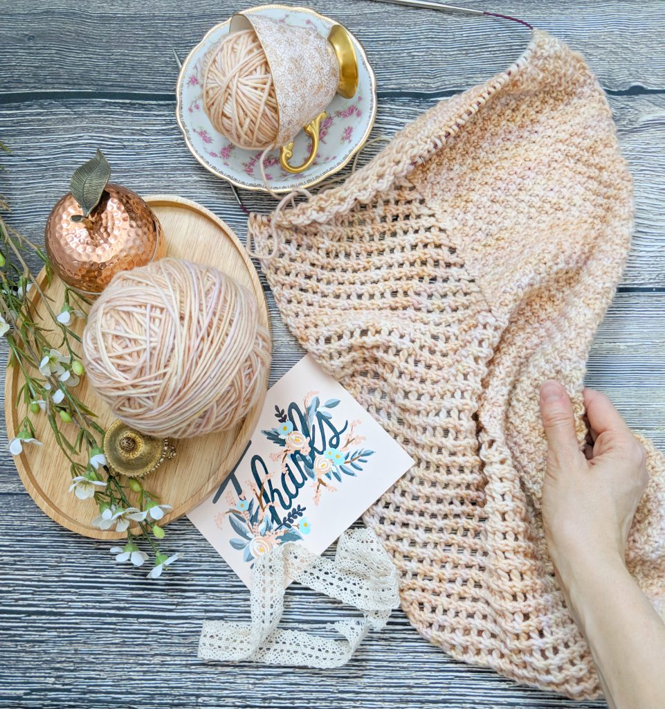 The yarn is from Darn Good Yarn, in the Samabyon colourway of their single ply worsted weight merino wool. I loved the watercolour elements of this yarn, with pale creamy shades of peach, pink, and buttercup melding into each other in a really dreamy way. I hardly ever choose pastel colours, but I wanted to try something a little different – what if I end up loving pastels?! I’ll never know if I don’t try. Breaking out of the colour rut we crafters tend to get into can be challenging – I can’t even begin to describe how much grey and green yarn I have in my stash. But this one just called to me.