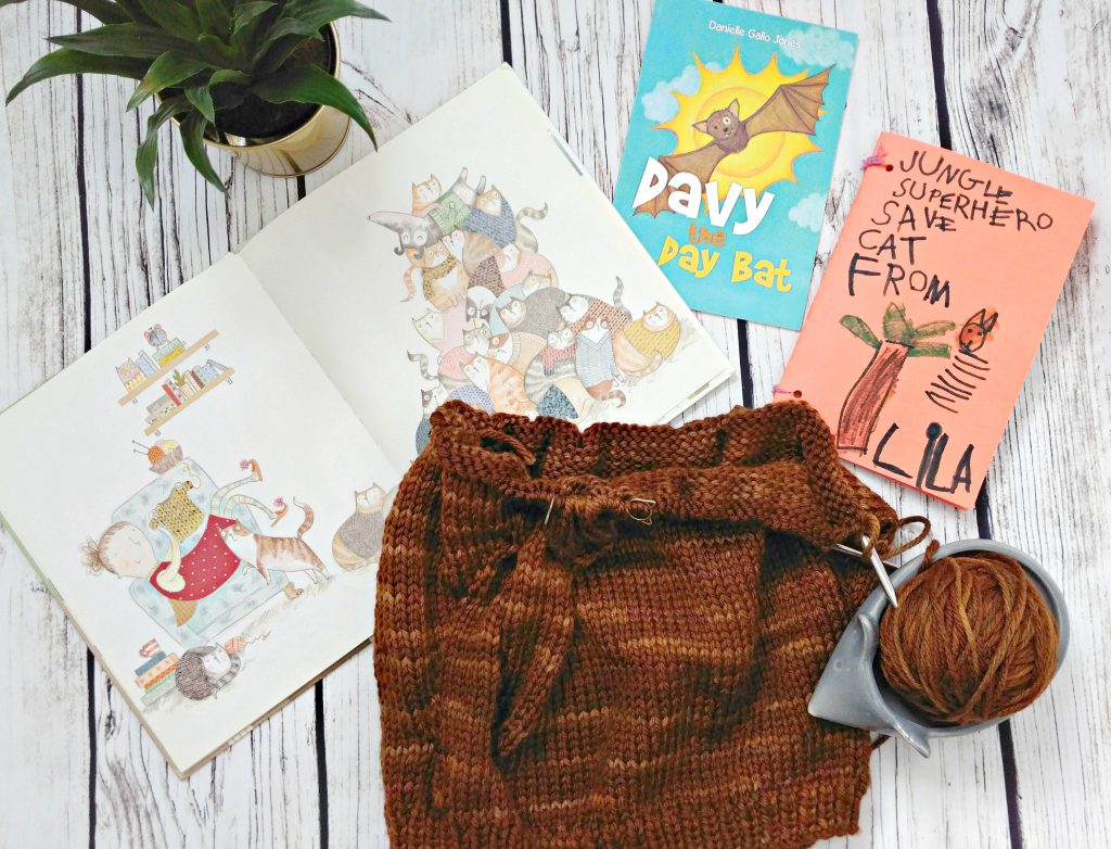I took the above photo with some of the things Lila likes to read lately – A Perfect Place for Ted is an adorable book about a dog looking for a home and has all sorts of knitting goodness in it, Davy the Day Bat is a sweet book about a mixed up bat (and Lila is obsessed with bats!) but is unfortunately put of print, and then we have a storybook of Lila’s own creation – Jungle Superhero Saves Cat from …. I’ll ruin the surprise, from a tree. The jungle superhero saves the cat from a tree.