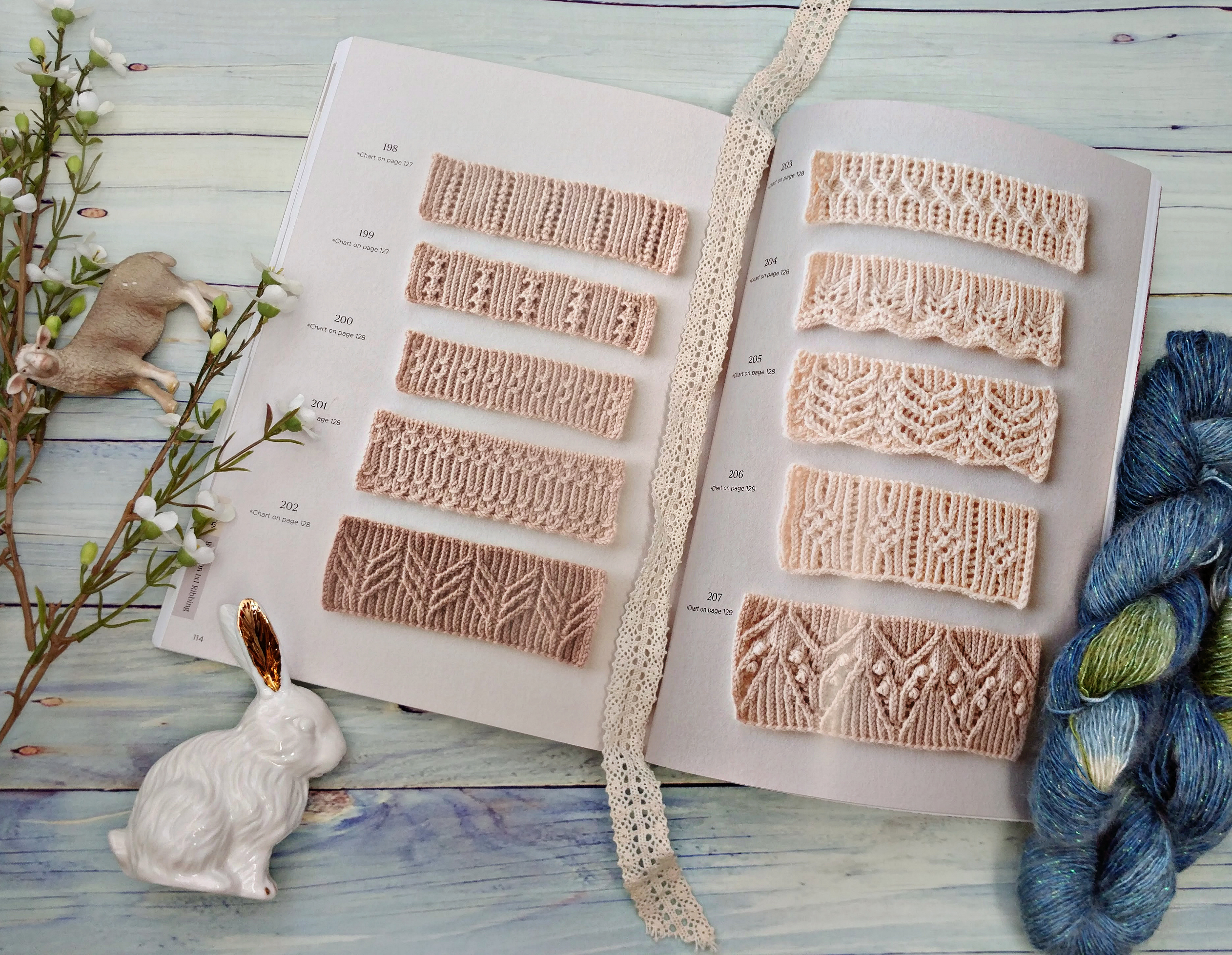 But this new version is going to save everyone a lot of effort in that department, with 260 different stitches fully charted with great instructions on all the chart symbols and stitches. Botanical elements, eyelets, twisted and crossed stitches, and serpentine cables are all here: