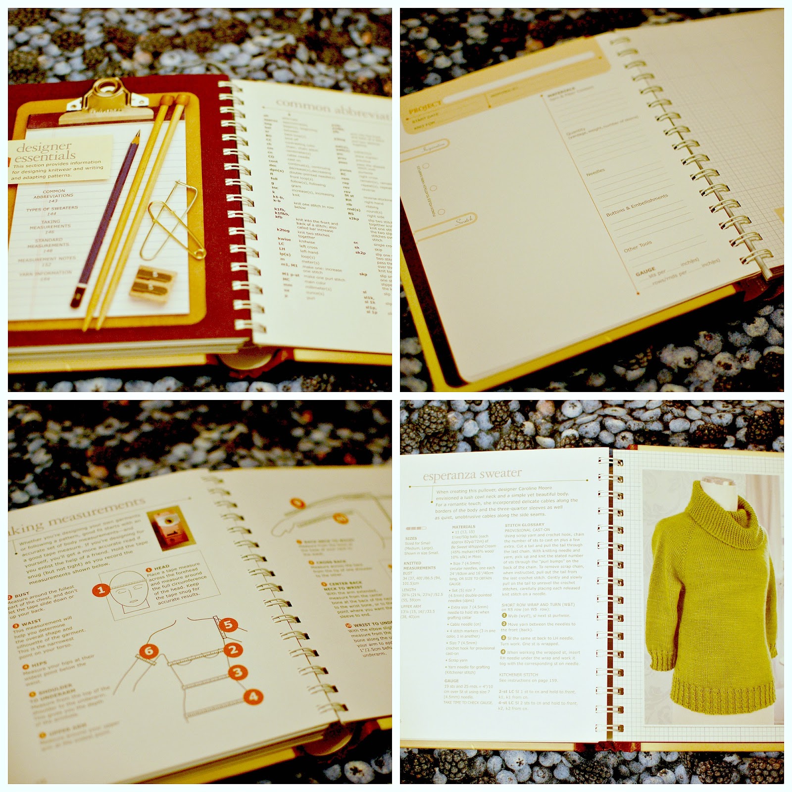 There are incredibly handy guides in the back of the notebook: an explantion of common knitting abbreviations, an overview on different types of sleeves, a guide on taking measurements, and charts for standard measurements for men’s, women’s, kids and babies sizes- sweaters and socks. There’s even a section where you cna document the measurements of those you knit for most- friends and family (or pets!). There is even a bonus pattern for a beautiful, classic funnel neck sweater.