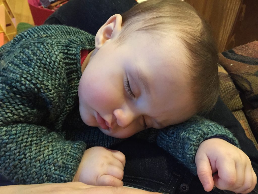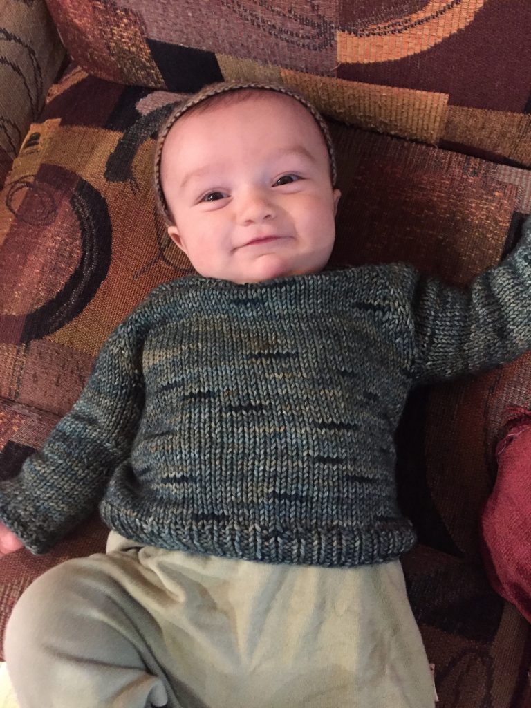 My son came home, perfectly happy and healthy one week after his hectic entrance into the world. I finished the sweater much later, although I don’t remember when. By the time he was six months old, it fit perfectly, and I became emotional as I put it over his head and