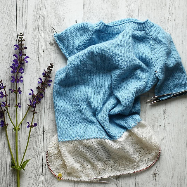 Mods: Changed the transition from the blue to white yarn, used a lighter laceweight for the bottom, and added lace stitches to the hem. Details can be found on her project page, here.