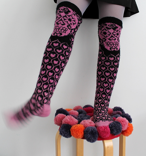 Mods: Matkailijakirppu combined the Elske sock pattern and lengthened them, incorporating the Day of the Dead Skull designs from the Calvera mittens. Details and great photos can be found on her project page here.