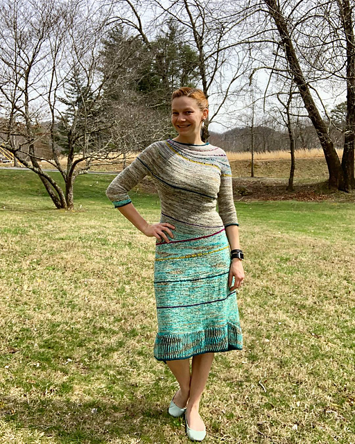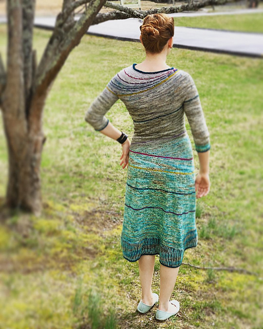 What Makes This Awesome: This dress does a fantastic job of taking the original pattern and experimenting with the shape. The slimmer fit sleeves have the same details as the body of the dress, and the gentle slope on the high-low hem – plus brioche as a hem!! Why are we not doing brioche hems on everything?! The swooping stripes are so great throughout the body of the dress, and allow a great way to play with colour- imagine this in high contrast solids, or gradient stripes… this is a gorgeous and very flattering dress, and would be amazing in almost any combinations of colours.