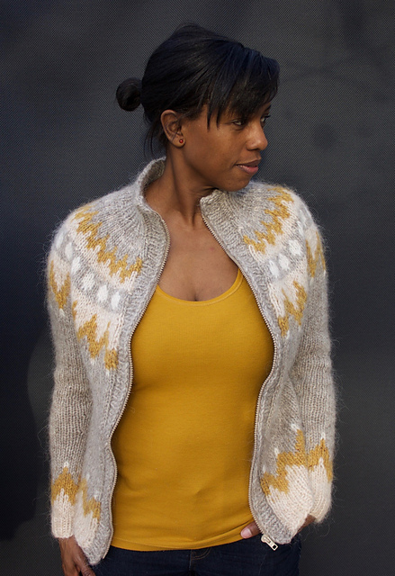 What Makes This Awesome: Even if there were no modifications, this sweater is spectacular. I love the colour choice of the grey, gold, and white; and this looks like the coziest sweater ever. I’m particularly impressed by her decision to reverse the direction of the sweater, as knitting it top-down and in the round allowed her to try it on as she went, which was extra important as she adjust the fit and length to suit her. If you are looking at a stranded sweater design and it is bottom-up try knitting it top-down, especially if the yoke is the round – that much easier! Turning the charts upside down can help with figuring out the new direction, and Jimi mentions in her notes that it was easier than she thought it would be. Steeking and installing a zipper aside (both not for the faint of heart!), I love the proportions of the ribbing on the zipper band in particular. it seems like a small thing to note, but it is very easy for button bands and zipper bands to be either a bit narrow or a bit wide for the overall sweater, and Jimi absolutely nailed it.