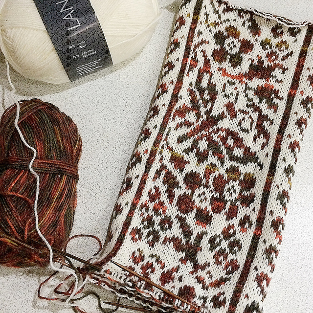 What Makes This Awesome: How amazing are these legwarmers?! Victoria has done an amazing job, alternating the mittens charts (the flowers and butterflies are oriented differently on the right from the left) and the cuff design. She also added side panels of a tidy row of hearts, forming a great stripe on both the inner and outer leg, which visually elongates the design and provides separation from the the charts on the front and back, which helps keep the design from looking too cluttered. I particularly like show she used a variegated and a solid yarn- the combination makes the design look even more complex, as though there is colourwork involved! For deep winter, I bet these are wonderfully warm, too.