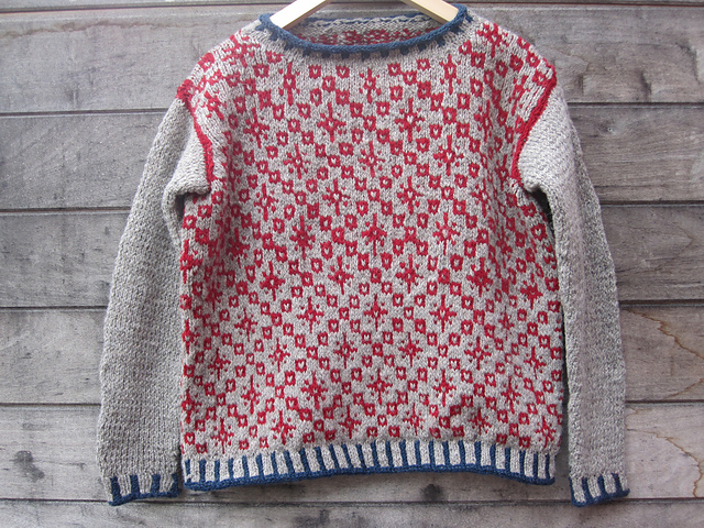 What Makes This Awesome:  Colourwork bodies and solive sleeves, I love this combo! But what I especially love about Helga’s sweater is that this is her first fair isle knitting, and her modifications were often chosen as a means of adjusting what was happening with the knit. Since she didn’t feel comfortable in doing colourwork with the shifting stitch count that would have happened on the sleeves, she opted for solid sleeves. She found the steeking directions easier from one pattern, so she followed those instead. When her neckline turned out a bit big, she added in some more knitting before starting the neckband.