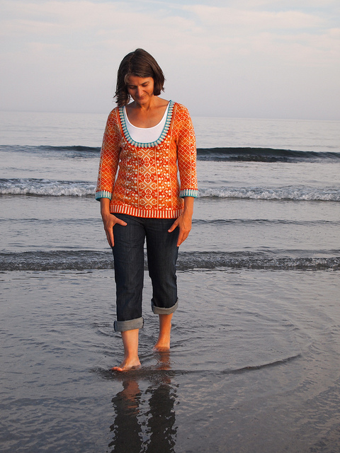 Mods: Misa used the Autumn Rose colourwork pullover as the road map, but substituted the charts for the Child’s Panel Gansey. Details can be found on her project page, here.