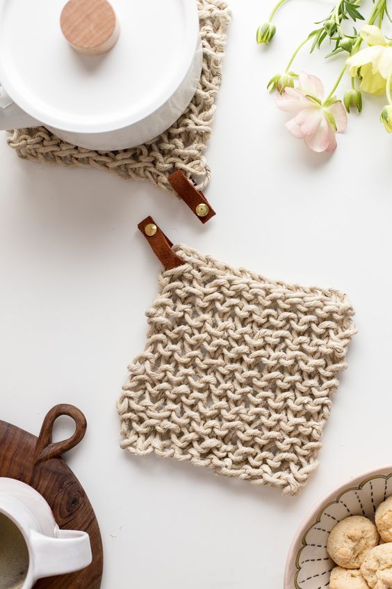 Lately I’ve been really loving little leather touches with knits. These lovely rustic potholders are so pretty,  with the hemp twine,  and the brass finishings. Pinterest link is here,  and the original post and pattern is here.
