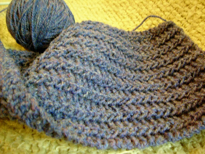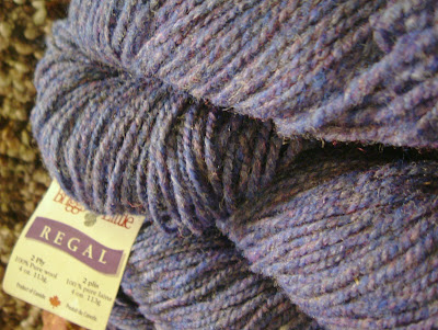 I had been doing very well on my yarn diet, until I came across 272-yard skeins of Briggs and Little yarn for $3.50 a pop. It was too cheap to pass up, so I bought out the whole stock (5 skeins) of Quoddy Blue, from the Regal line:I love that heathered blue.