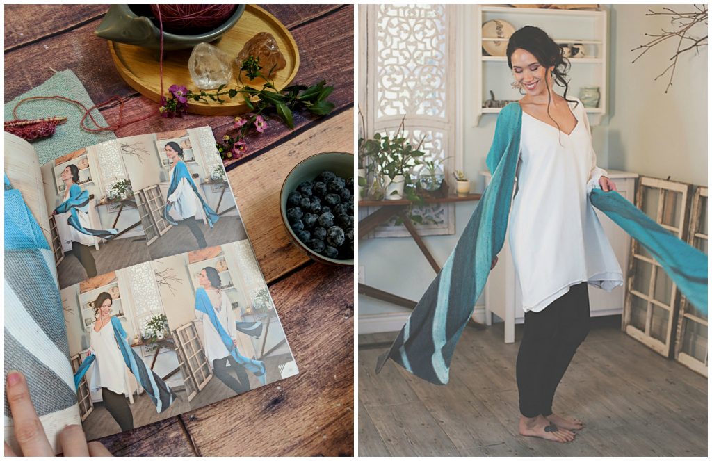 Perfect for blending together two gradient skeins of fingering weight yarn (shown here in The Blue Brick Killarney Sock), This is all about the squishy garter stitch- perfect knitting for road trips and anywhere you want to be where you don’t need to keep looking at your hands. And then you end up with a colourful wrap wrap that looks like it’s perfect for just about every season.