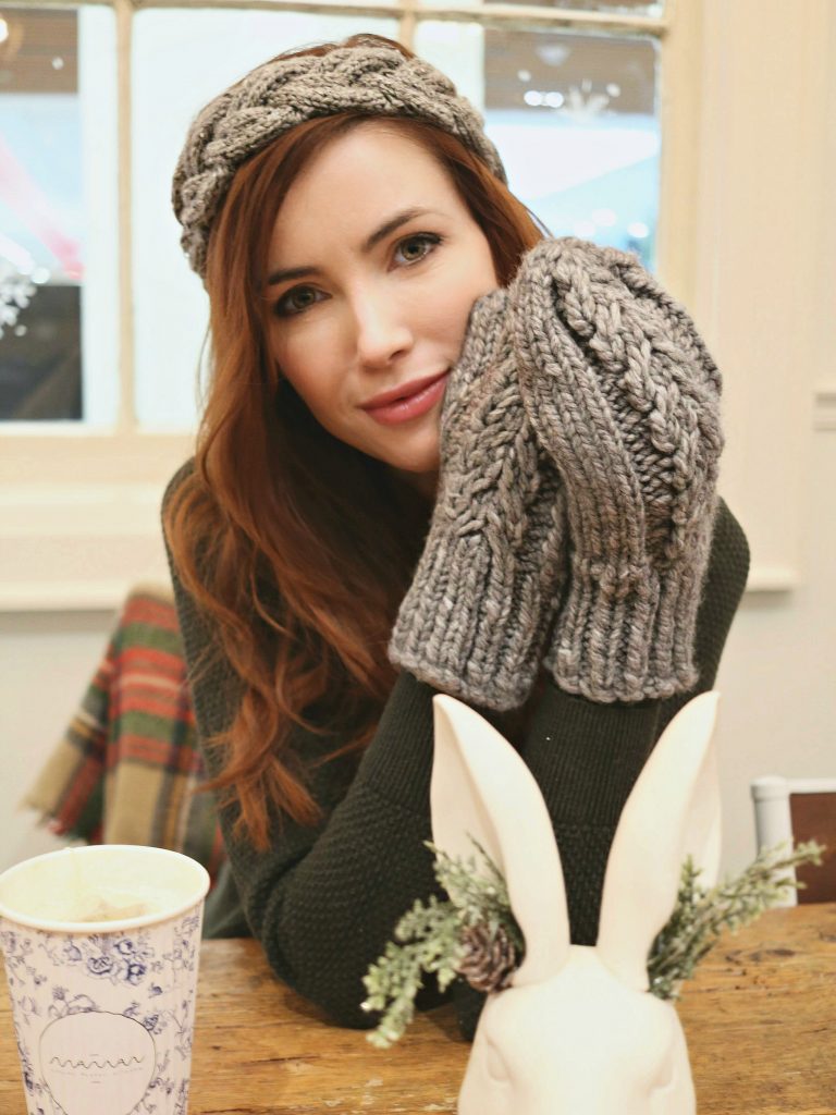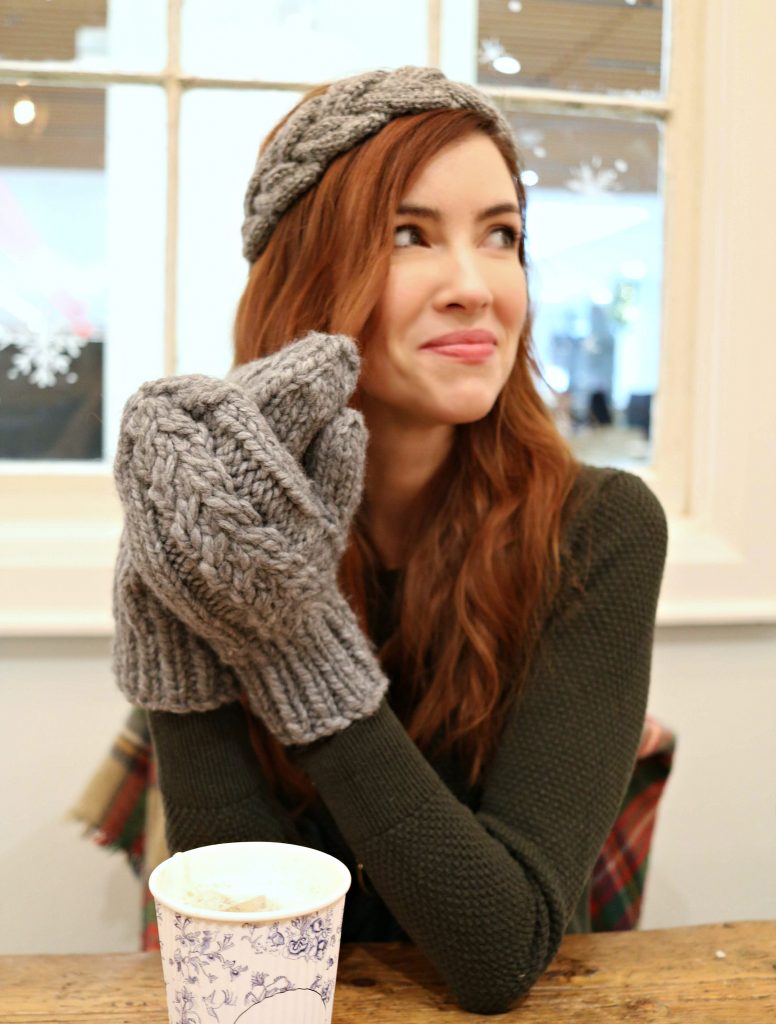 Another quick knit idea? That cabled headband I’m wearing. It’s the Bulky Braided Headband pattern (free), and knit in Patons Shetland Tweed Chunky in the Pewter colourway. This headband takes so little yarn, you could probably knit 3-4 headbands with a single skein of the Patons Shetland Tweed Chunky. Or maybe use some of your leftover Bernat Wool Up Bulky! I should have thought of that, but I knit the headband first (you can see it in progress in this post here), and then thought about the mittens… oh well. They still look really good together, even if they aren’t the exact same yarn!