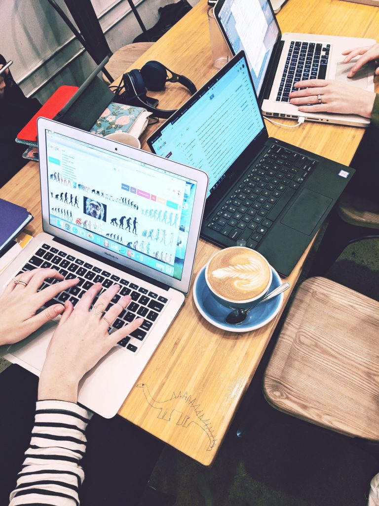 Don’t let all those gorgeous photos from Creating Light Studio (they had a photo shoot at Make Lemonade one day, can you tell?) fool you into thinking that is what every day of my work life looks like. I go in a few times a month. Otherwise, it’s either the top photo of this post (hi, couch!), or I’m working in a cafe. Below is a photo I took last week, at a coffee-and-work hang with some friends. At the table: a geneticist, a graphic designer, an account director, and me (the uncool one with the obvious black PC laptop in front of the empty chair). All of us working. No, we didn’t draw the stegosaurus on the table.