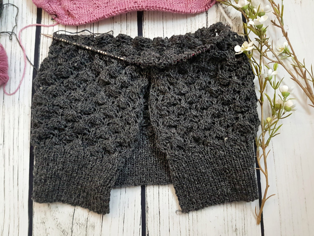 I’m loving Pomm de Pin so far, I’m just at the stage to divide for the arm holes. I was surprised at how easy it was to memorize the stitch pattern!